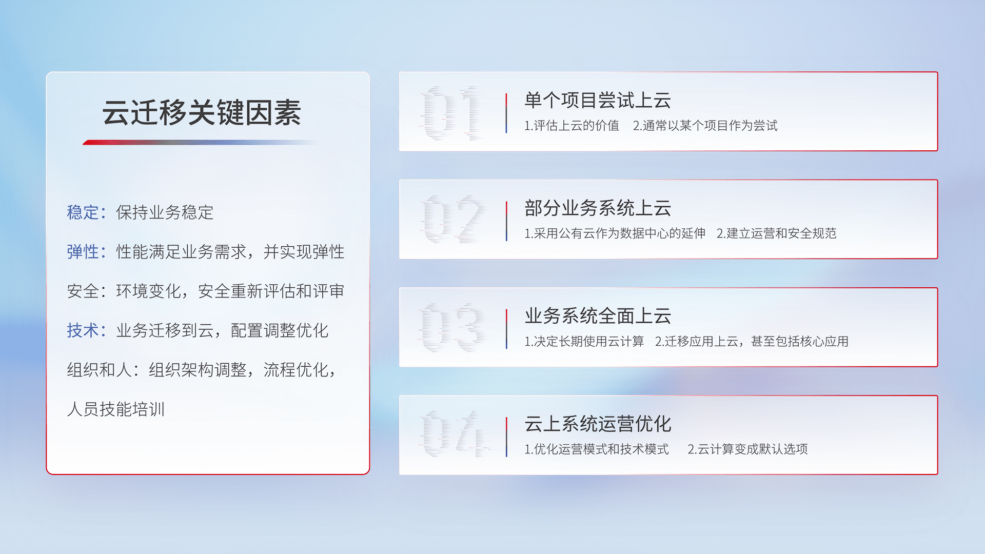 结合实际业务,,,,从规划设计、、、云平台选型、、、、云原生改造、、、、数据迁移、、、集成交付,,迁移全过程为客户识别最佳上云路径,,做好风险识别管理,,,,设计网络架构、、身份权限、、、、安全审计合规、、、操作审计、、、、日志审计、、监控告警策略、、、、多站点容灾设计等,,,,对云上基础设施进行整体规划,,,提升IT治理水平,,,以满足弹性、、高可用、、、、高性能的需求。。。
