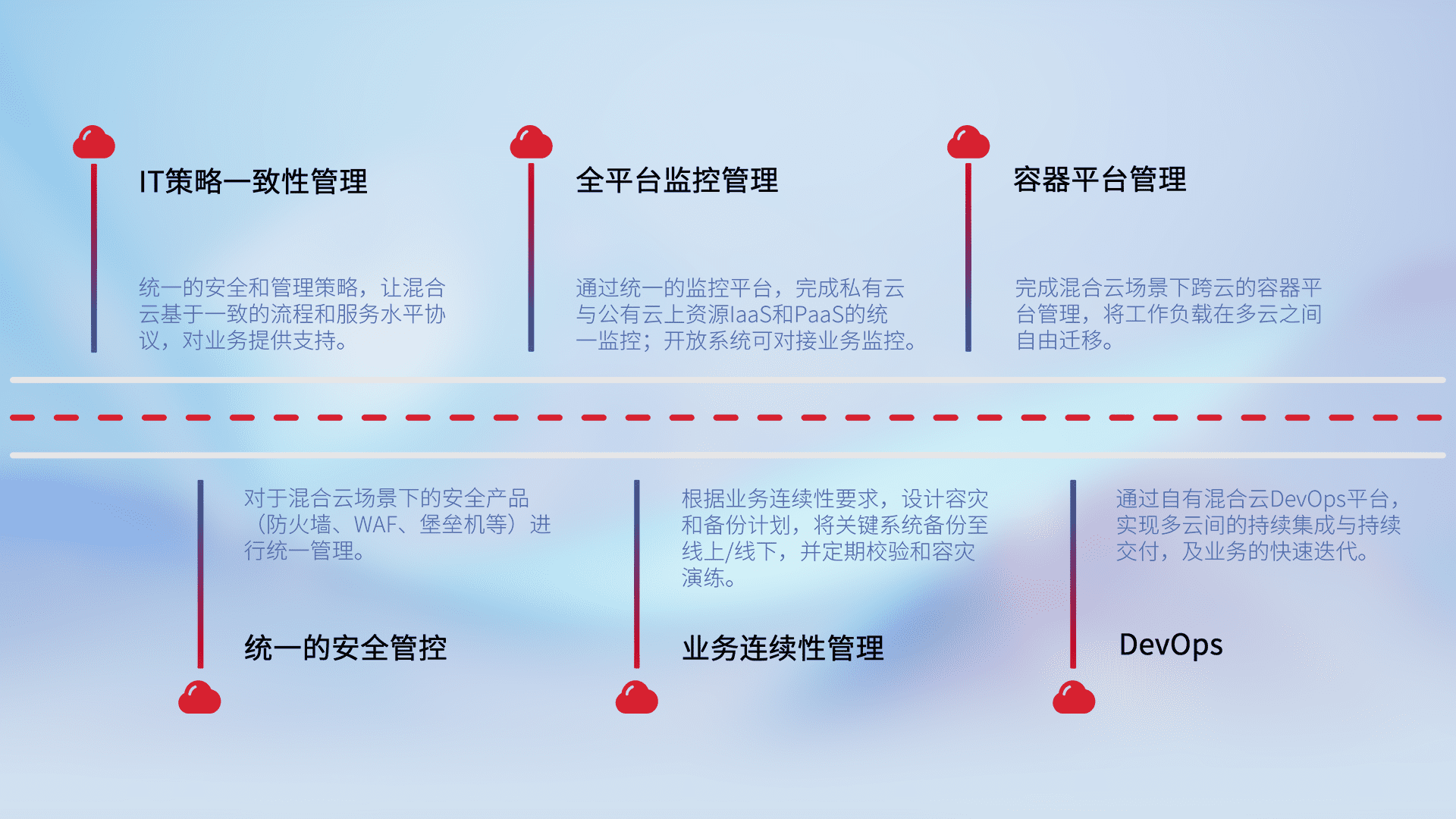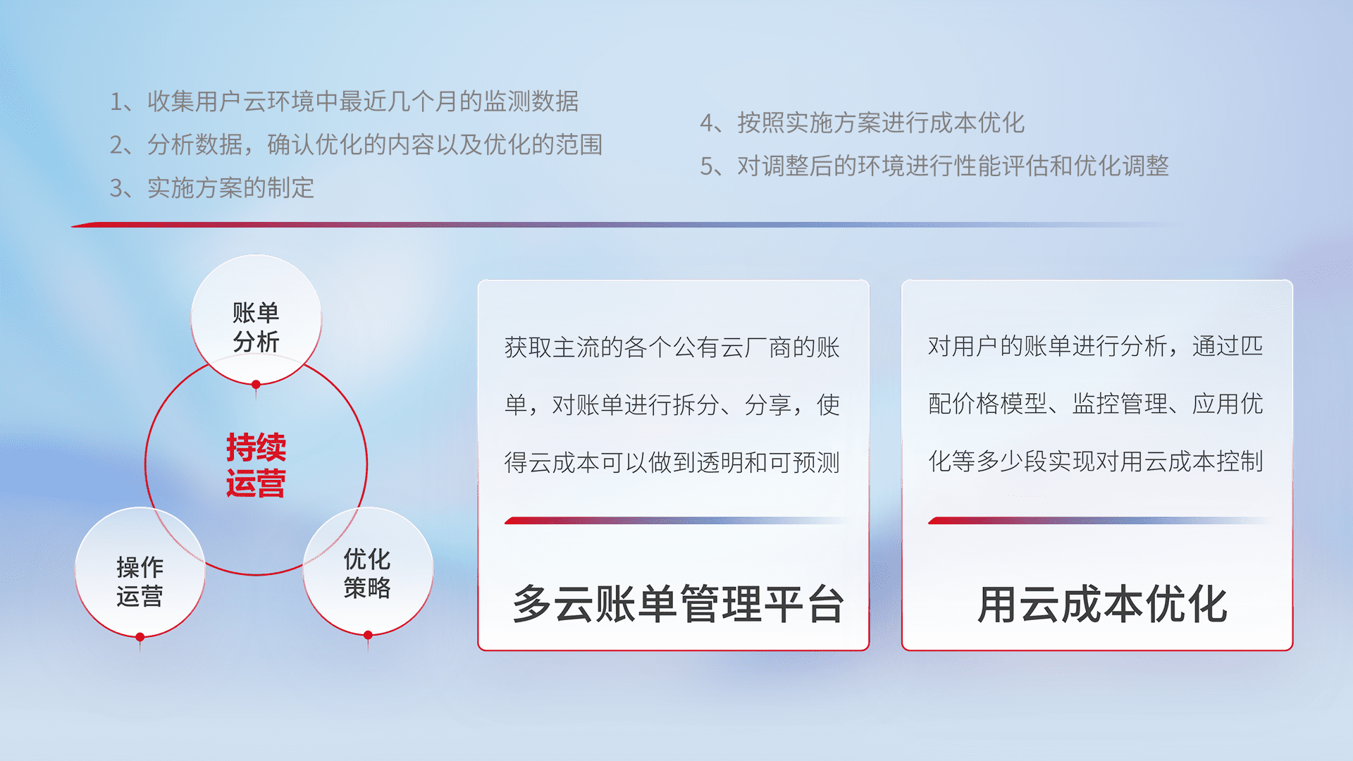 通过多云纳管,,,,以统一的资源数据模型把客户的云资源进行抽象和封装,,,,进而实现对多云资源的统一操作,,保障云资源管理的可靠性、、、稳定性与可用性。。。量身定制化运维内容,,配置、、、开发运维、、补丁管理、、、、备份、、、监控、、认证和访问管理、、、、审计和日常巡检等,,,,保障在用云过程中的可靠度,,稳定度以及高可用率。。。